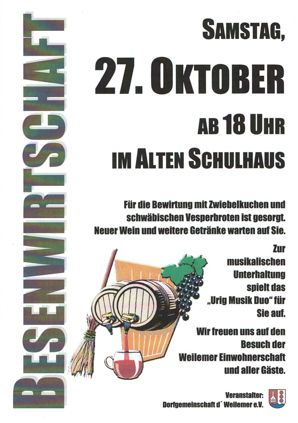 am Samstag, den 26. Oktober 2019 werden wir im Alten Schulhaus wieder gemeinsam unsere mittlerweile traditionelle Weilemer Besenwirtschaft veranstalten.