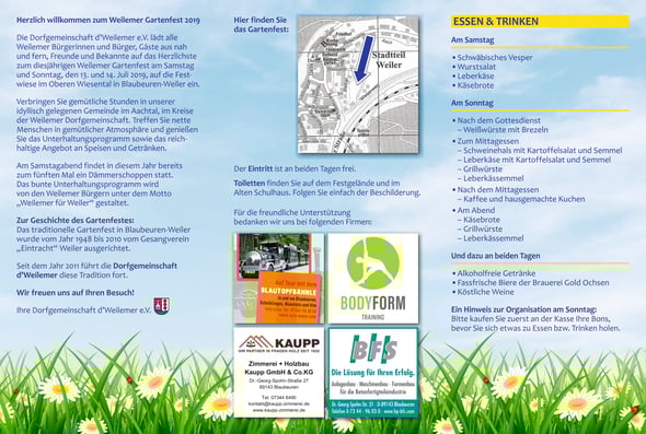 Nicht nur die Namensgebung ist neu. Auch bei der Durchführung der Veranstaltung ergaben sich Veränderungen, denn künftig arbeitet die GfU mit mehreren Weiler Vereinen und Gruppen zusammen. Diese sind in Kooperation: die Dorfgemeinschaft d´Weilemer e.V., der Tennisverein Weiler e.V., die Freiwillige Feuerwehr Blaubeuren - Abteilung Weiler, die Evangelische Kirchengemeinde Weiler und die Turnermänner Weiler. Während die GfU nach wie vor für die fachlichen pädagogischen Bereiche zuständig ist, unterstützen die Vereine und Gruppen beim Auf- und Abbau sowie bei der Bewirtung.